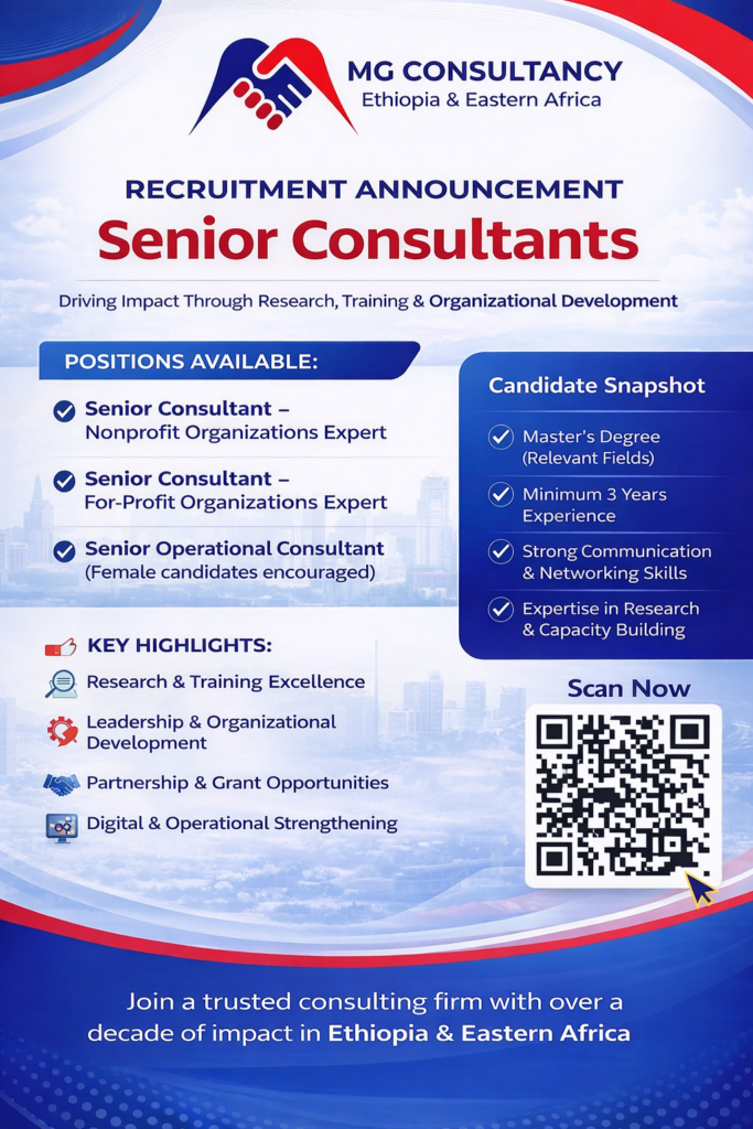 Since 2012, MG Consultancy has been a trusted partner in Ethiopia and Eastern Africa, delivering high-quality consulting services in research, training, organizational development, and leadership capacity building. We work with nonprofit organizations, enterprises, and international partners to provide evidence-based solutions that drive impact and sustainability.